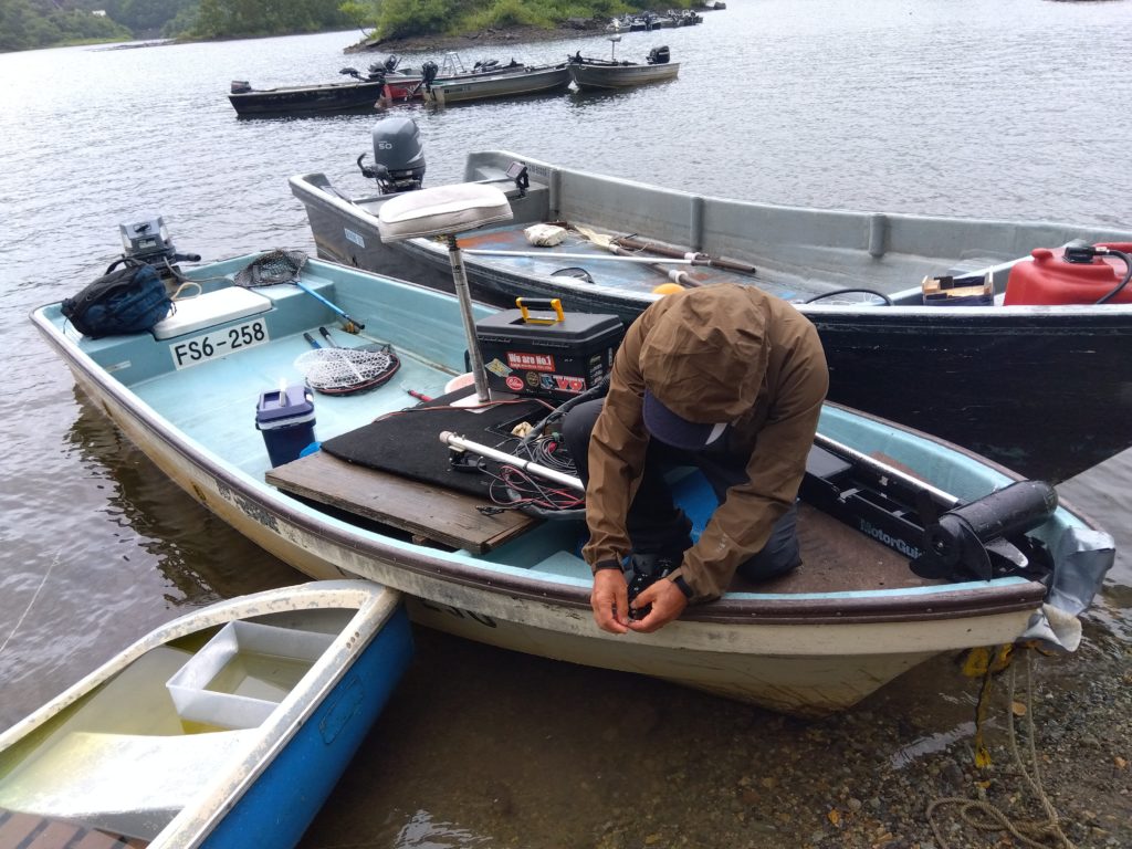 8月30日(金)朝は小雨でしたが、ボート置き場につく頃には雨もあがり曇り空。なんとか釣りができそうで一安心、そしてボートに乗り込んで驚きの嵐! まず船のエンジンですが後ろに標準的なディーゼルエンジンスクリューがあるのですが、舳先にももう一台「不思議なスクリューエンジン(バッテリーで動く電池式)」がついているのです。これが湖での釣りには大活躍、静かに船を自由に操ることができるのです。釣りポイントにたどり着き、魚を驚かせずに静かに移動できる優れものでした。さらに舳先に棒にようなものがついていて、なんと「魚群探知機」。水面下をしっかりのぞきながら魚の群れを探しつつ静かにポイントに近づくことができるのです。ちょっと驚きの装置付きの釣り船でした。